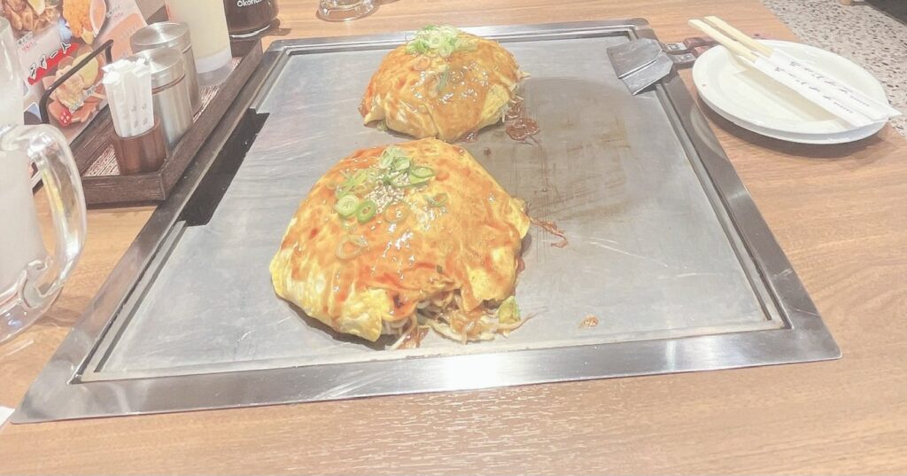 広島では本場のお好み焼きも楽しみました。この形で鉄板の上に置いてくれます。